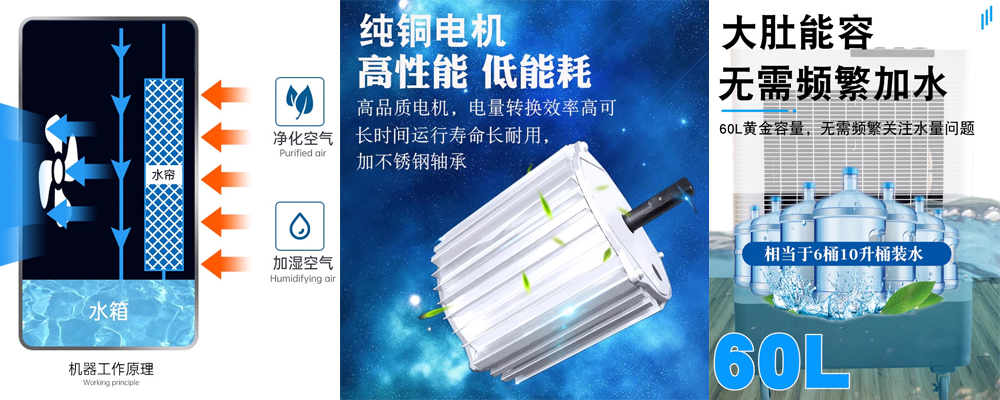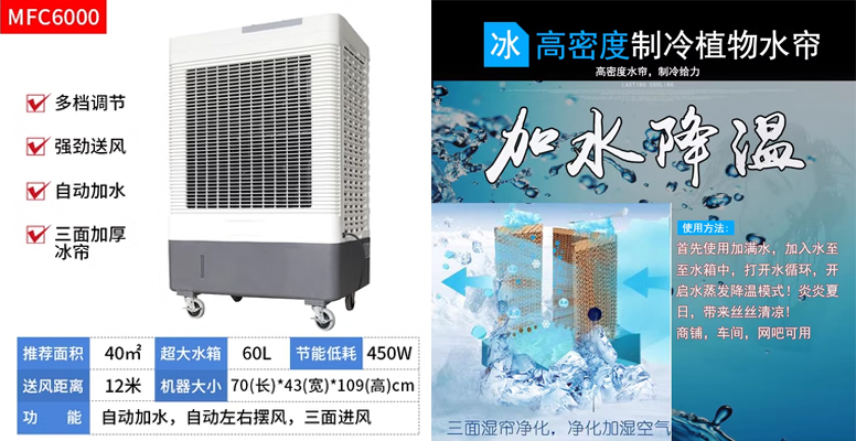 工廠、倉儲、大型商場等常年需要長時間降溫環(huán)境,雷豹移動式冷風機MFC6000連續(xù)長時間強效持久降溫,輕松搞定多種情景,超長時間作業(yè)滿足工業(yè)商業(yè)降溫需求,7.5厘米超厚冰簾強效制冷,專業(yè)級5090冰簾,加寬加厚植物纖維冰簾越厚面積越大,蒸發(fā)效率越高,降溫效果越好,引流槽設(shè)計降噪,科學引流槽設(shè)計,降低噪音,低水流聲,綠色節(jié)能低能耗,環(huán)保安全,為您節(jié)省每一度電,水容量大,降溫才能更持久,遠離多次加水,450W超大功率,超強制冷,享受舒適健康夏天。便捷旋鈕控制面板,一目了然的面板簡潔易懂的操作,自動&手動雙重注水方式,正面手動注水口,背面自動接水口,背部有排水口,有水位顯示窗和萬向滾輪,快速降溫 清涼來襲。