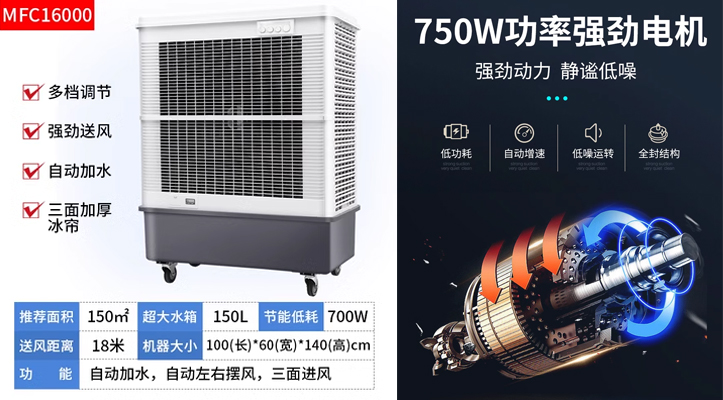 雷豹移動式冷風(fēng)機(jī)MFC16000尤其適合家用/商鋪/網(wǎng)吧/養(yǎng)殖等地方,冷開機(jī)瞬清涼制冷迅速,立即見效,使用7.5厘米植物纖維高蒸發(fā)率加厚冰簾,急速降溫,倍感清涼,30寸尼龍材質(zhì)扇葉采用不易變形的鋁合金軸套,使用壽命長,延長送風(fēng)距離,全方位促進(jìn)空氣對流,700W大功率,功率越大風(fēng)量越大,涼爽整個大空間,超廣角立體送風(fēng),距離高達(dá)18米,大范圍釋放清涼,6級優(yōu)質(zhì)電機(jī)帶來更具性價比的功耗,150L一體式水箱設(shè)計,一次加滿相當(dāng)于300瓶500ML礦泉水,大容量舒適更持久,便捷式旋鈕控制面板,一目了然的面板,簡潔易懂的操作,擁有防掉落的注水口、底部排水口、水位顯示窗、移動萬向輪,強(qiáng)效降溫,倍感清涼。